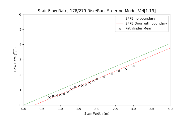 Compared to the SFPE calculations, the Zhang and Seyfried experiments have a higher occupant speed (measured free velocity of 1.55 ± 0.18 m/s) and a significantly higher measured specific flow (although the paper notes large specific flow variations for small changes in the experimental setup for densities greater than 2 pers/m2).