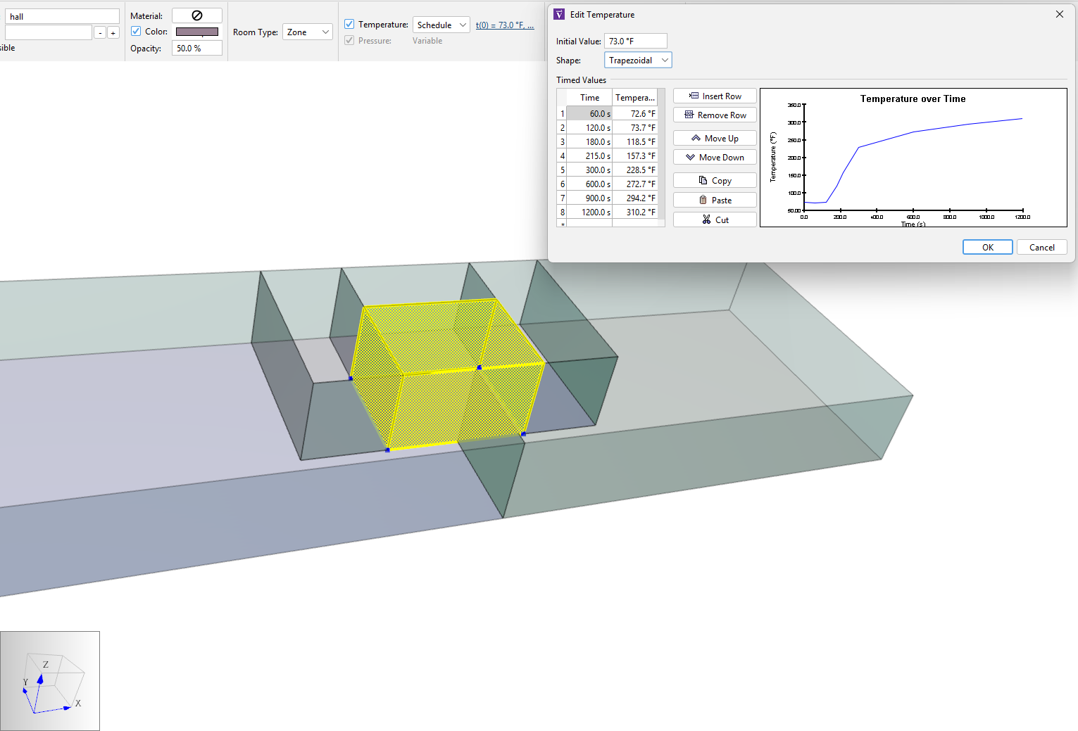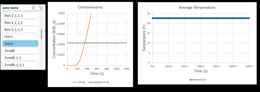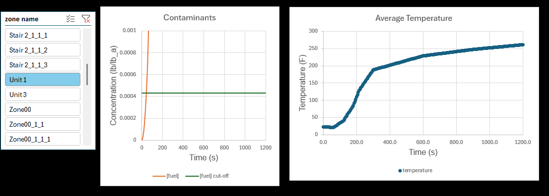 NearFld02_compartments.csvfile, providing data for the Unit 1 Zone and hall Zone. Compute one average Zone temperature from the CFAST compartment (two-layer) temperature information. This calculation is performed in theT_av-calcsheet of thesmoke-scenario-results-processing.xlsxfile from the zip folder; technical details are presented in section Tav Calculation.