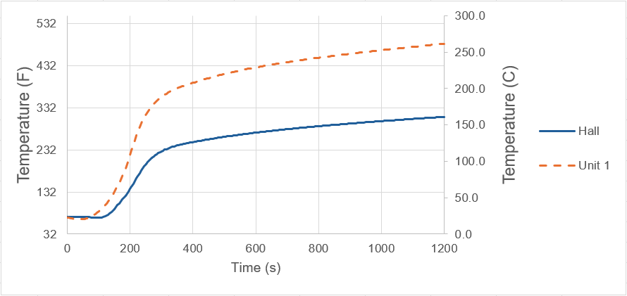 | Time (s) | Unit 1 T_av, °F (°C) | hall T_av, °F (°C) |
