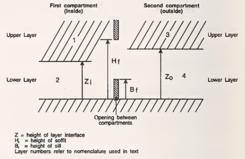 As in Figure 19, the opening ("vent") can be partitioned into as many as ten flow segments ("slabs") in CFAST to account for multiple boundaries and directions of flow. For simple compartment fires with standard air mixture, six is the maximum number of required slabs (CFAST, the Consolidated Model of Fire Growth and Smoke Transport 1993).