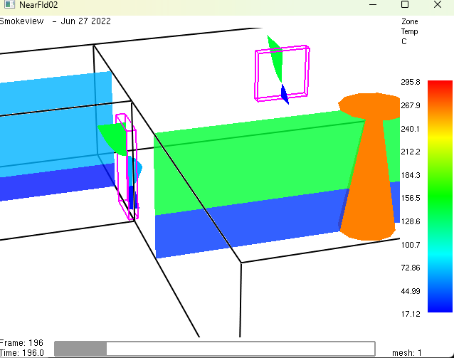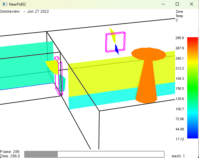 - A colorful visual representation of the fire (NearFld02.smv) appears in the Smokeview application as shown in Figure 2 from this tutorial’s Overview section.