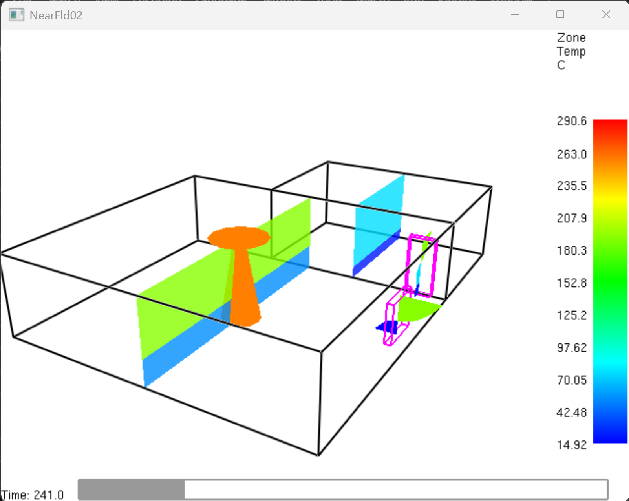 If you look closely at the doorway Flow Path (vent) graphic while playing the NearFld02 results simulation in Smokeview, you can see the number of slabs and flow regime graphics changing as the fire develops like Figure 20 and Figure 21.