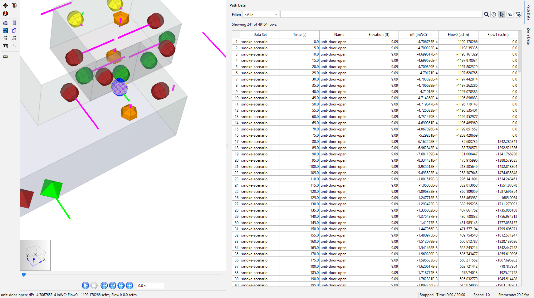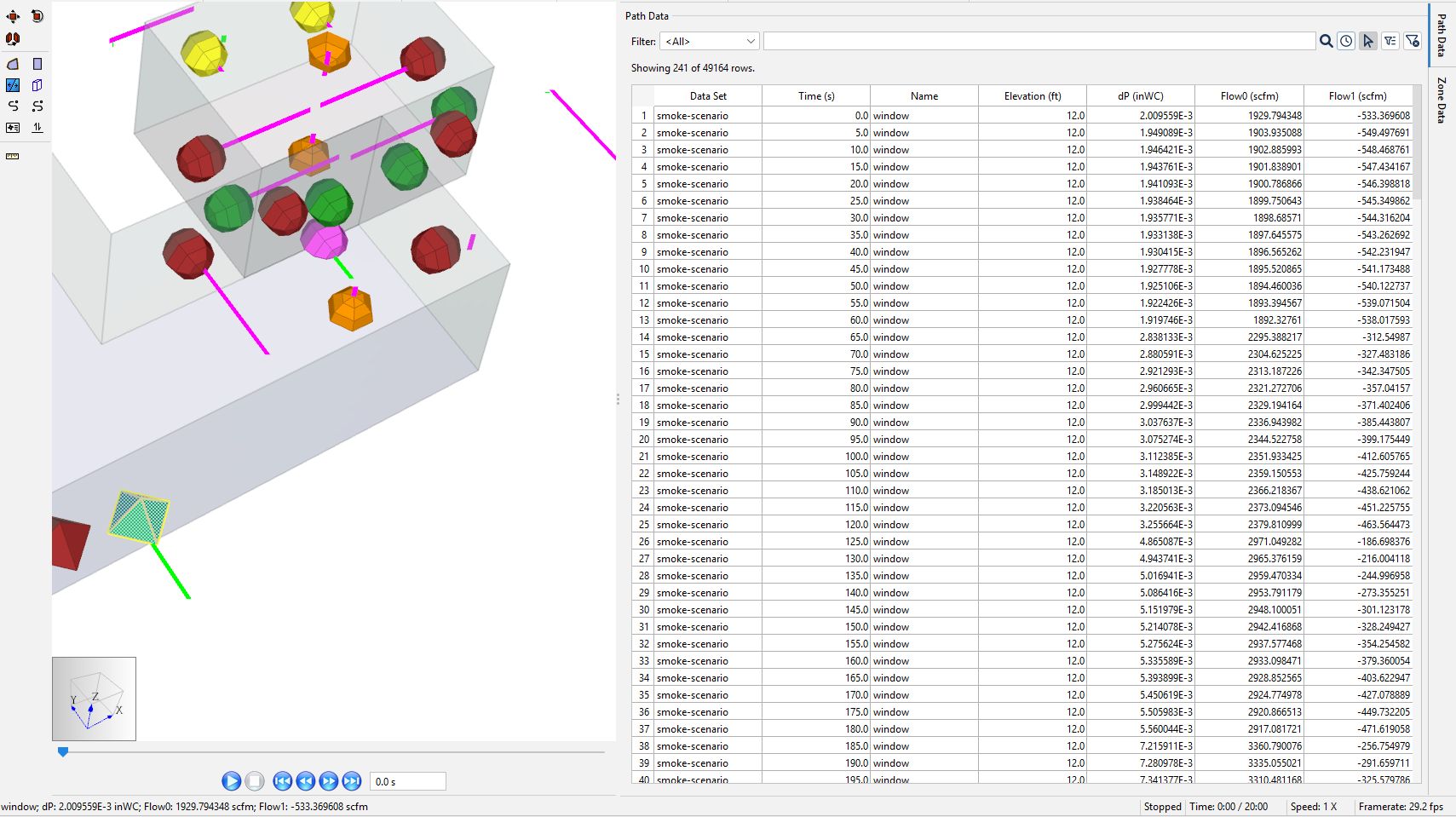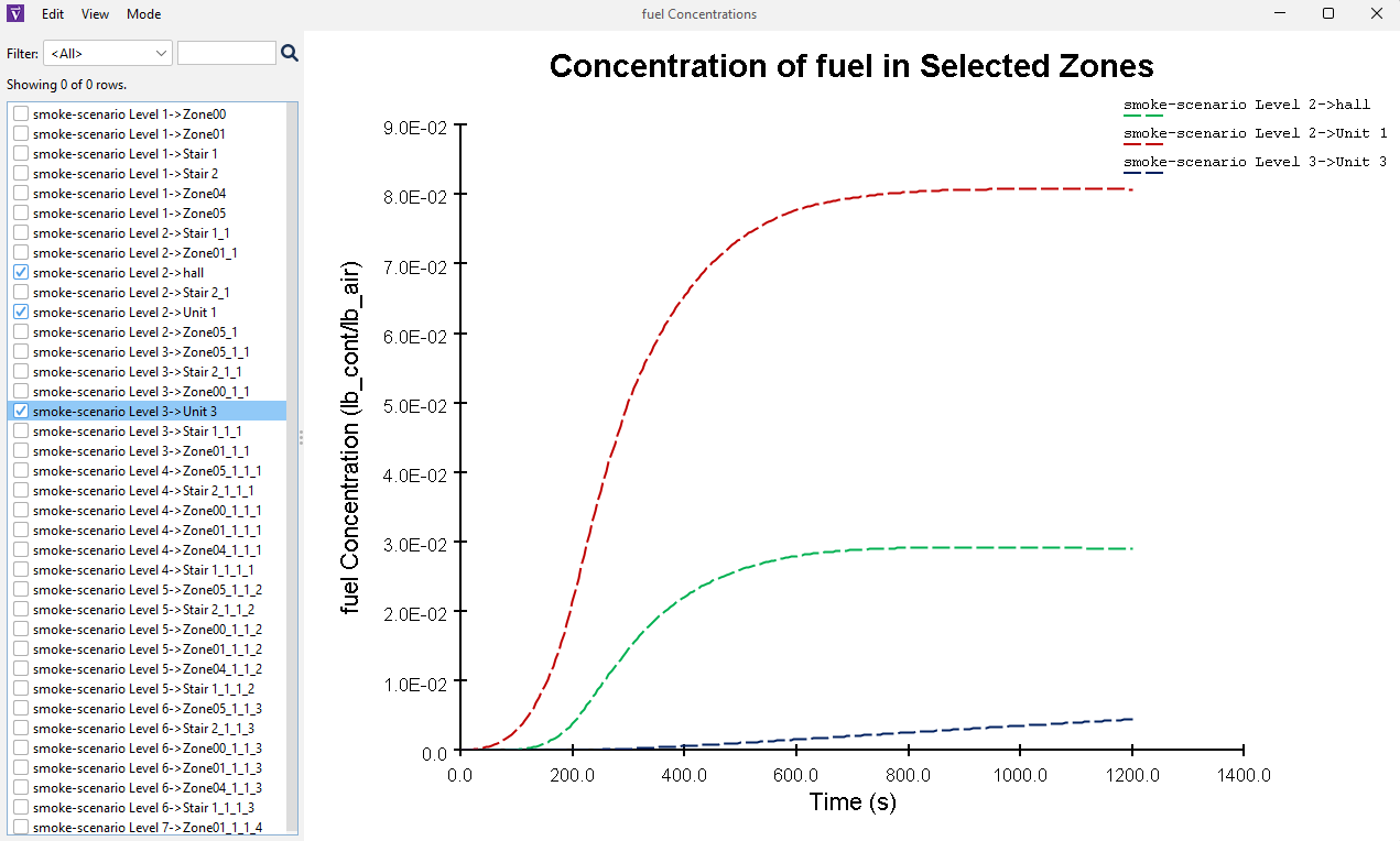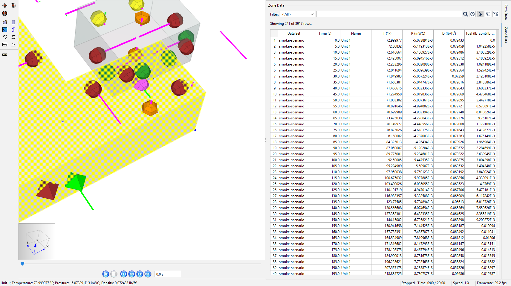 Near-field CFAST fire simulation outputs (included in the Starting Point subfolder of the ZIP) are used to characterize Ventus inputs. Build on the model from Ventus Validation #3 and analyze tenability over 20 minutes. Tenability is determined by the maximum allowable concentration of soot, 3.26x10–5 lb/ft3 (5.18x10-4 kg/m3) (Handbook of Smoke Control Engineering 2012).