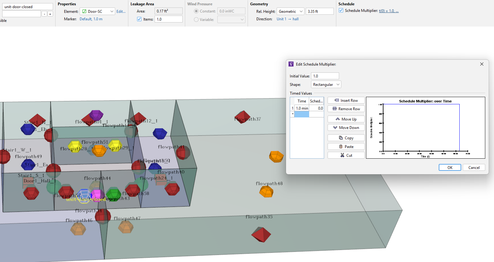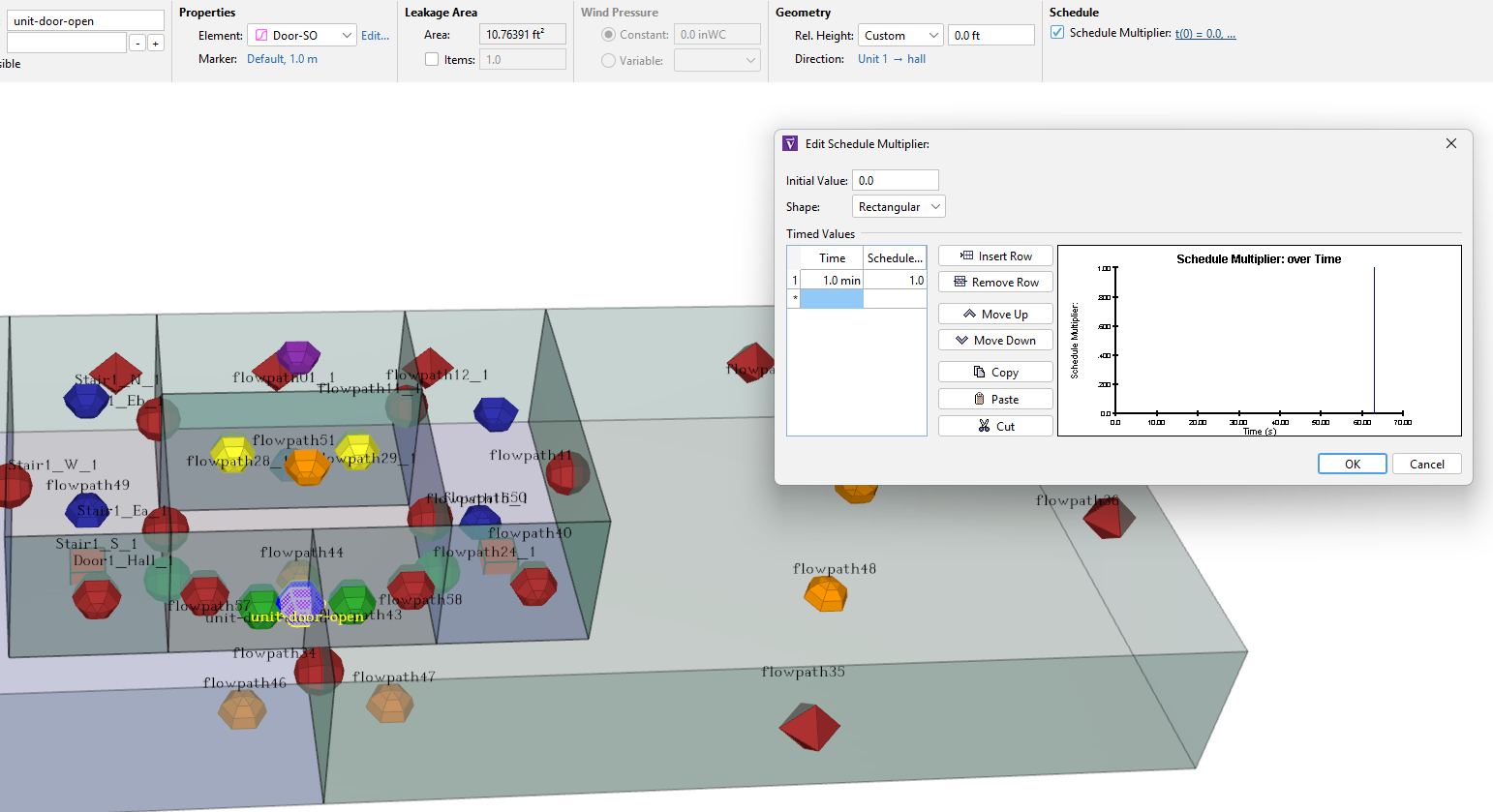 - The door between Unit 1 and the hall opens at time t=60 s and remains open for the remainder of the simulation. The doorway measures 3 ft (0.914 m) wide by 6.7 ft (2.042 m) high, with a discharge coefficient of 0.75. Again, two-way flow is expected.