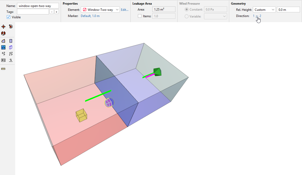 In Ventus, users can calculate bidirectional flow with the Two-way - One Opening Flow Element as in Figure 2.